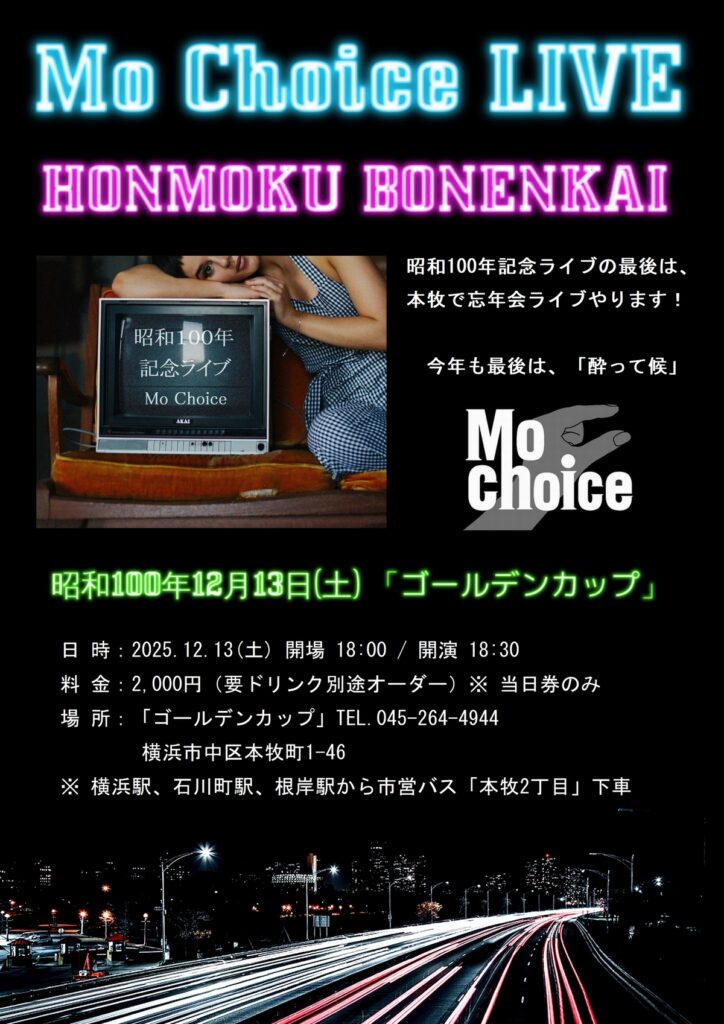今回のライブは、昭和100年記念ライブとして、10月吉野町「こびとさん」、11月横須賀「COOL COLL」と終えて今年最後は、本牧「ゴールデンカップ」で忘年会ライブを行います。いつもの通り、皆さんと飲んで盛り上がり2025年の締めくくりとなるようメンバーも気合を入れて飲みます。演奏もしますよ・・・まだ「ゴールデンカップ」に来店されていない方も是非、この機会にお越しください。お待ちしております!