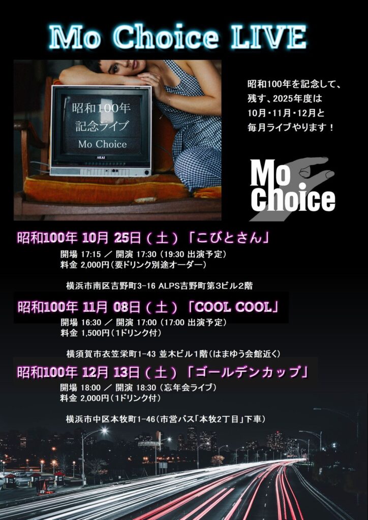 ライブ情報『MoChoice Live 昭和100年』 投稿日2025年10月14日2025年10月14日投稿者honmokuコメントをどうぞ 2025年は、「昭和100年」です!その記念として、残す2025年度は、10月・11月・12月と毎月ライブを開催します。皆さんと一緒に昭和100年記念で盛り上がりましょう。メンバー全員でお待ちしてます。 共有: Facebook で共有するにはクリックしてください (新しいウィンドウで開きます) Facebook 関連